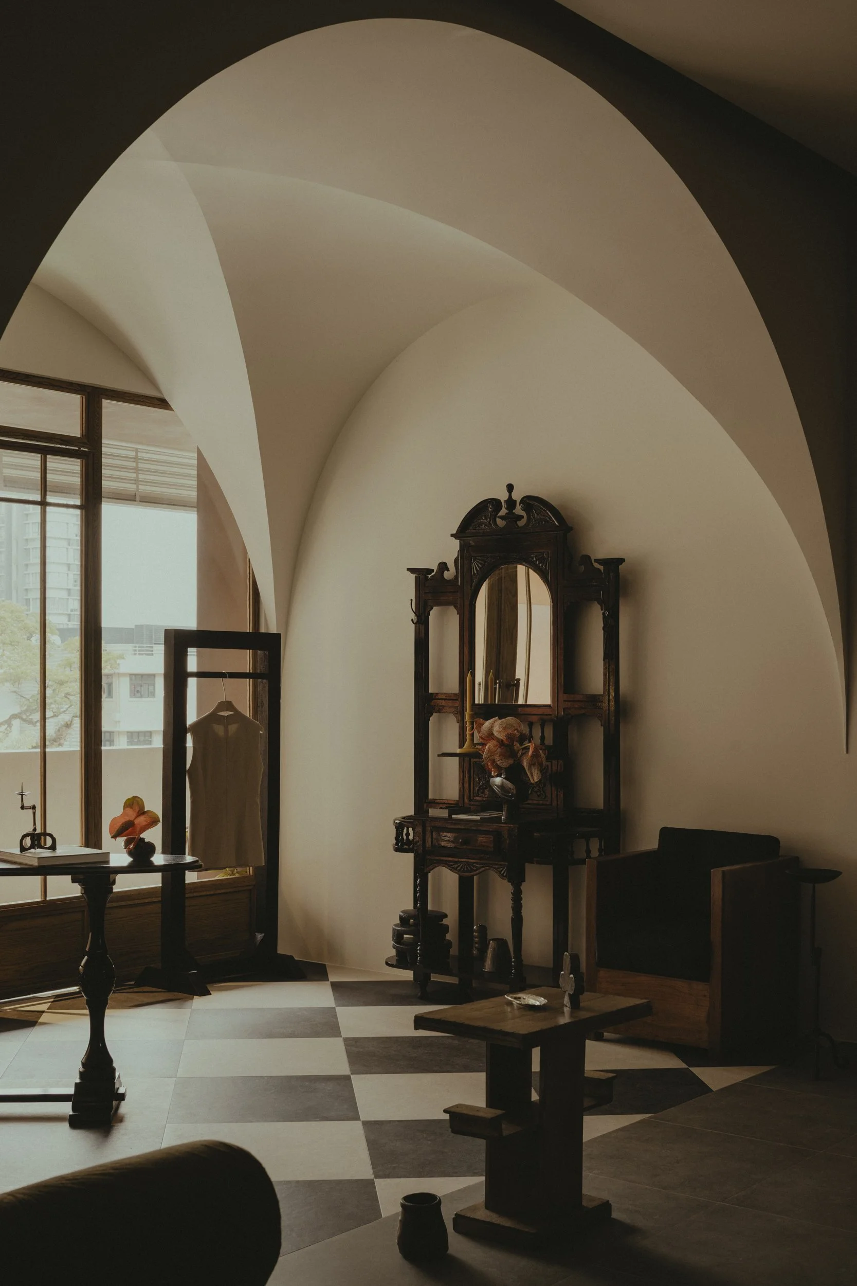 The client expressed a love for palazzos and European architecture, and it was up to Pupil Office to incorporate these elements in a way that felt natural and authentic, avoiding any sense of artifice. A striking groin vault ceiling in the foyer nods to classical design, setting an elegant tone upon entry. Warm wood tones are used throughout the space, complemented by surprising pops of colour to add depth and interest. Simultaneously, the design integrates pieces sourced by the client from South Asia, creating a fluid and cohesive environment that enhances the shopper’s journey through the store.